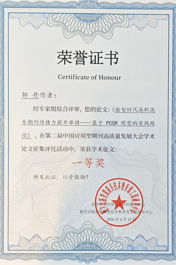 会议优秀论文评选中,襄阳职业技术学院学报副主任邹丹撰写的《数智时代高职高专期刊传播力提升举措——基于PCSR模型的实践路径》,结合PCSR模型探讨期刊传播力提升路径,兼具理论与实践价值;学报编辑孙莉撰写的《“双高计划”背景下医学技术专业群人才培养模式创新研究——以职教本科医学检验技术专业建设为引领》,聚焦人才培养痛点,为高职院校专业群建设提供参考。两篇论文经专家评审脱颖而出,同获优秀论文一等奖,彰显学校期刊建设与学术研究实力。